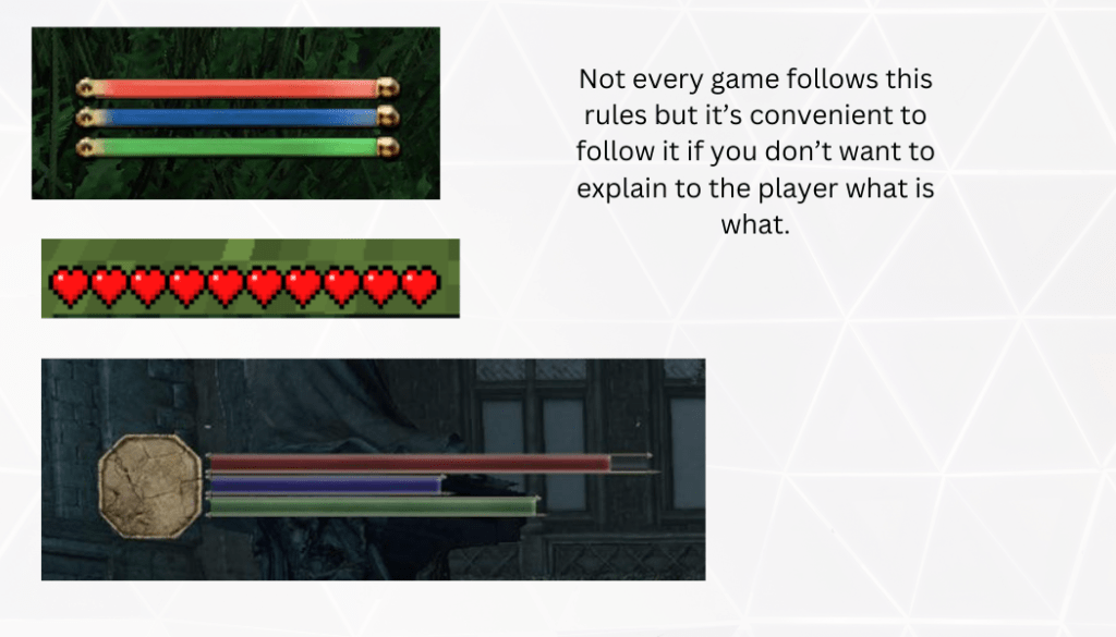 To begin with, I shall describe the most obvious interface markers: health, mana and stamina. In the majority of RPGs, for example, you will be able to see that health bar is always red, mana/magic bar is blue (but it can also mean hydration depending on the genre), and stamina is commonly depicted as green. Just like I have mentioned in the previous post, yellow, theoretically would have fit better being the primary colour but it’s not as graphic as green, so it has been substituted in the main three.