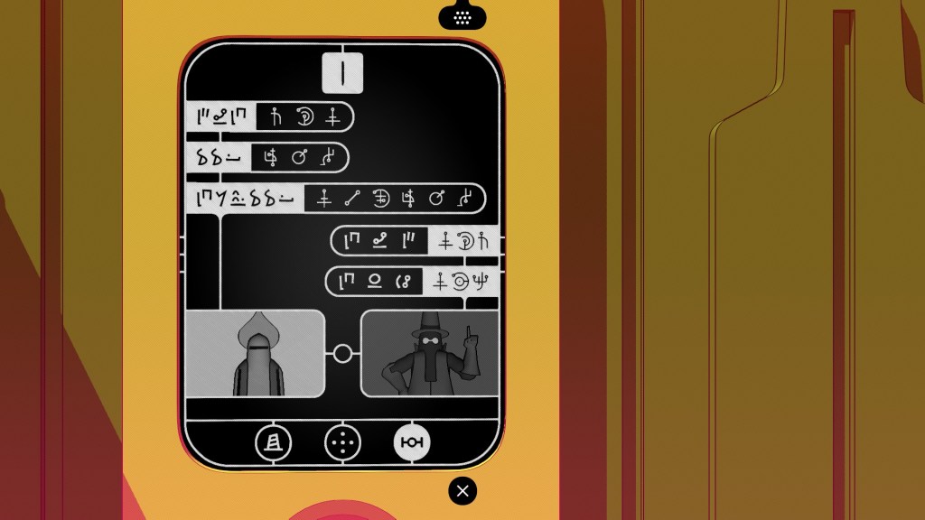 Alright, this is the final post on the Chants of Sennaar languages. This one is about the Anchorites’ language. These people are also known as the Exiles and I may refer to them as such at times. This is the final language and it’s acquisition in game is much faster than with the previous languages and I’d say is far less organic, but is the part where you learn the global plot of the game, which I don’t want to spoil here. Either way, the task of this chapter mostly consist of translation and I may argue that this is the language that is the least developed in game compared to the rest. It’s far more structured than many, but at the same time I hesitate to call it a good system. Nevertheless, more on that later.