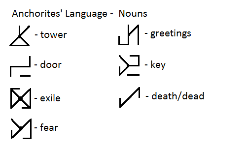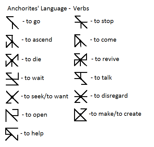 I’m sorry but “to not die” and “to revive” are not the same concepts, yet their writing is supposed to be the same. This part of the Anchorites’ languages is the most confusing one for me. It’s not so bad with nouns only because they are not as cluttered as verbs, but still this lead me to the main issue of this language: