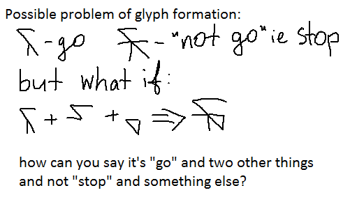Additionally, this is the reason why I wonder if it’s possible to combine more than two radicals in one glyph. How many of the glyphs in Anchorites’ language are actually homographs? I can only imagine it being solved by different pronunciation in speech, but what about reading?