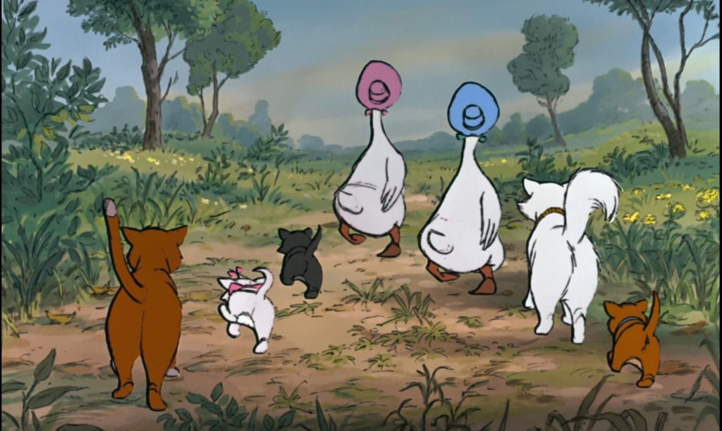 One of the important topics that is touched upon throughout the story is etiquette and education. We can see it in the very beginning with Duchess teaching her kittens to thank others for their help and watching her children draw, play the piano, and sing. Needless to say, these artistic abilities help them get along with O’Malley’s friends later.