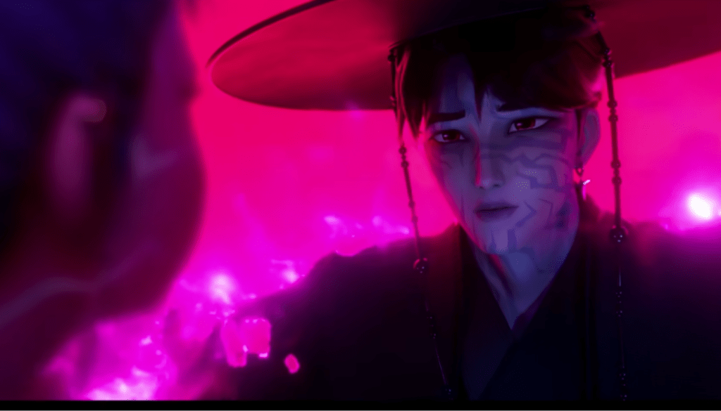 With that said, I would like to touch upon the subject of faith which is highlight in abundance in the film. It’s prominent from the start but not very noticeable until Rumi’s meeting with Jinu where suggests him to stay on Earth when the Honmoon will be sealed. She tells him “if there’s no hope for you, what hope is there for me?” To me it was the brightest signal of practically blind faith. She didn’t know if she would stay on Earth and not be dragged to the underworld, but she had faith. That’s why her return to the stadium in the end might have been shown as a twist but was very unsurprising. She truly believed that she must protect humans from demons and remained faithful till the end. That’s why her demon scars glowed in the end, she was fully accepted by the Honmoon because she had an unwavering faith in it.