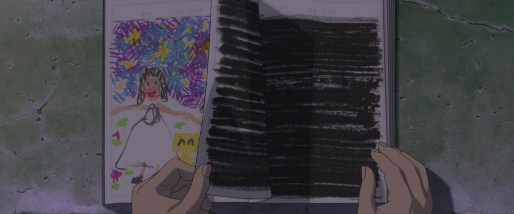 How can we forget the scene where a child stops drawing cute and funny drawing and starts smudging the pages with black one by one… It’s a very silent yet expressive way to show how traumatic event can divide one’s life to “before” and “after”.